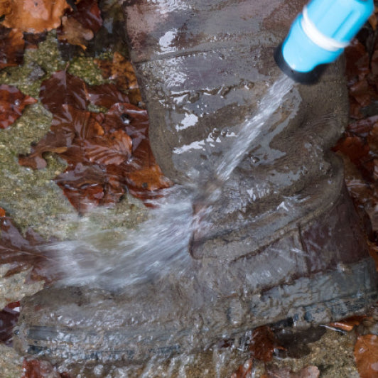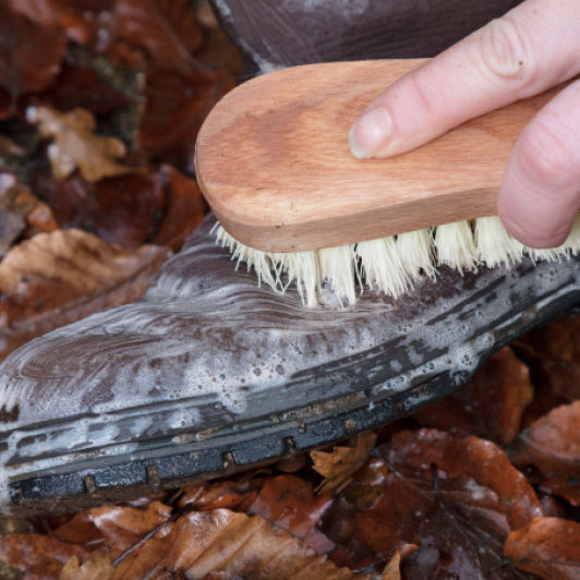 Bürsten Sie allen losen Schmutz von den Schuhen und spülen Sie sie leicht mit Wasser ab. Footwear Cleaner auftragen und mit einem Schwamm oder einem Tuch über die Schuhe reiben. Gründlich ausspülen, aber nicht zu sehr einweichen.