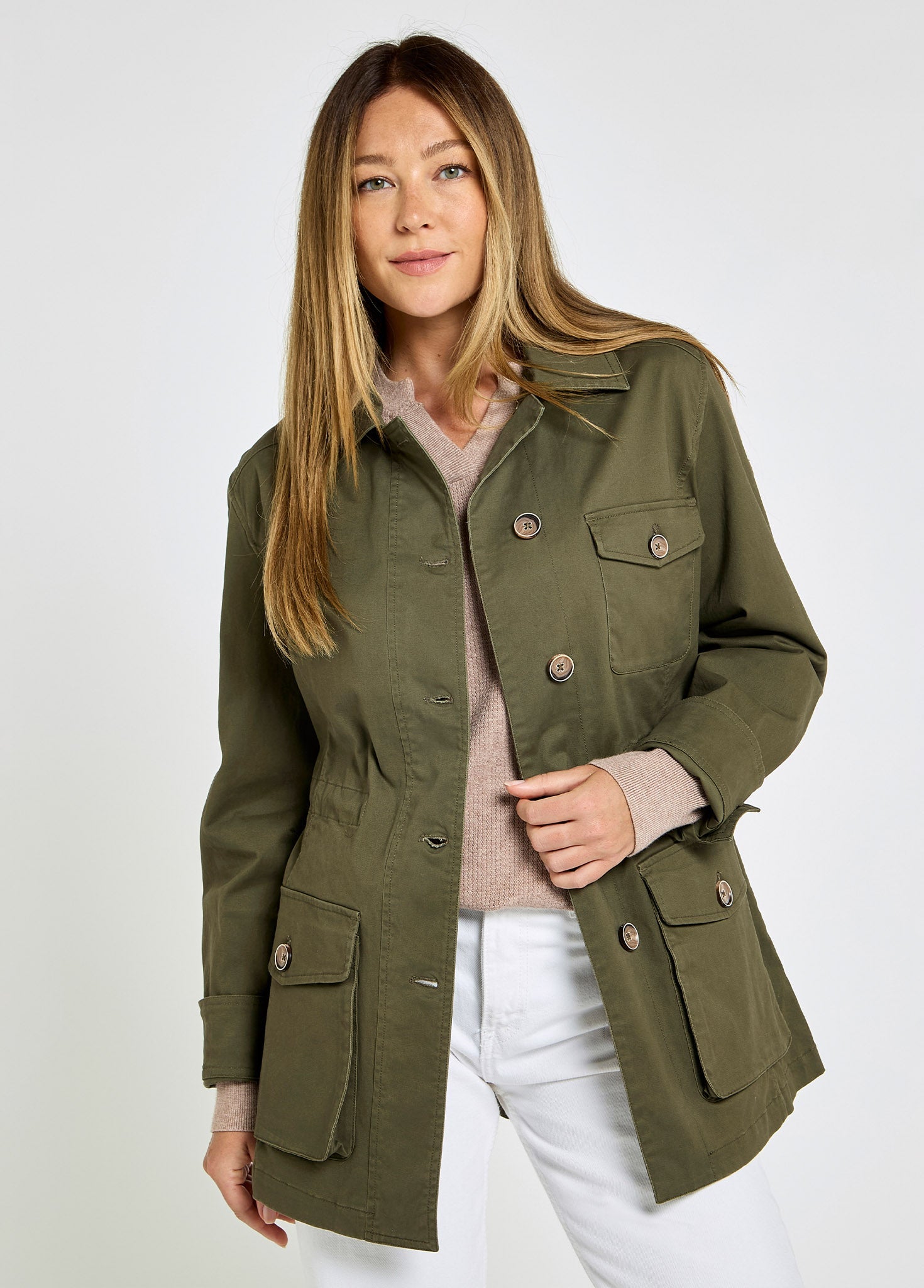 - Geräumige und praktische Taschen mit Klappen und Knöpfen.